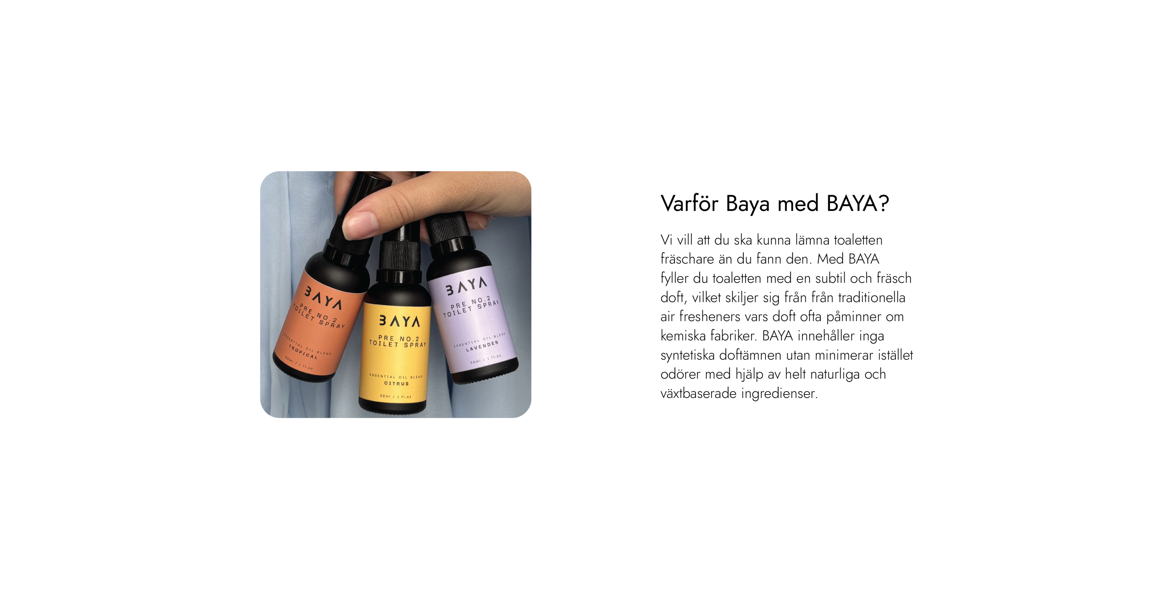 Vi vill att du ska kunna lämna toaletten fräschare än du fann den. Med BAYA fyller du toaletten med en subtil och fräsch doft, vilket skiljer sig från traditionella air fresheners vars doft ofta påminner om kemiska fabriker. BAYA innehåller inga syntetiska doftämnen utan minimerar istället odörer med hjälp av helt naturliga och växtbaserade ingredienser.