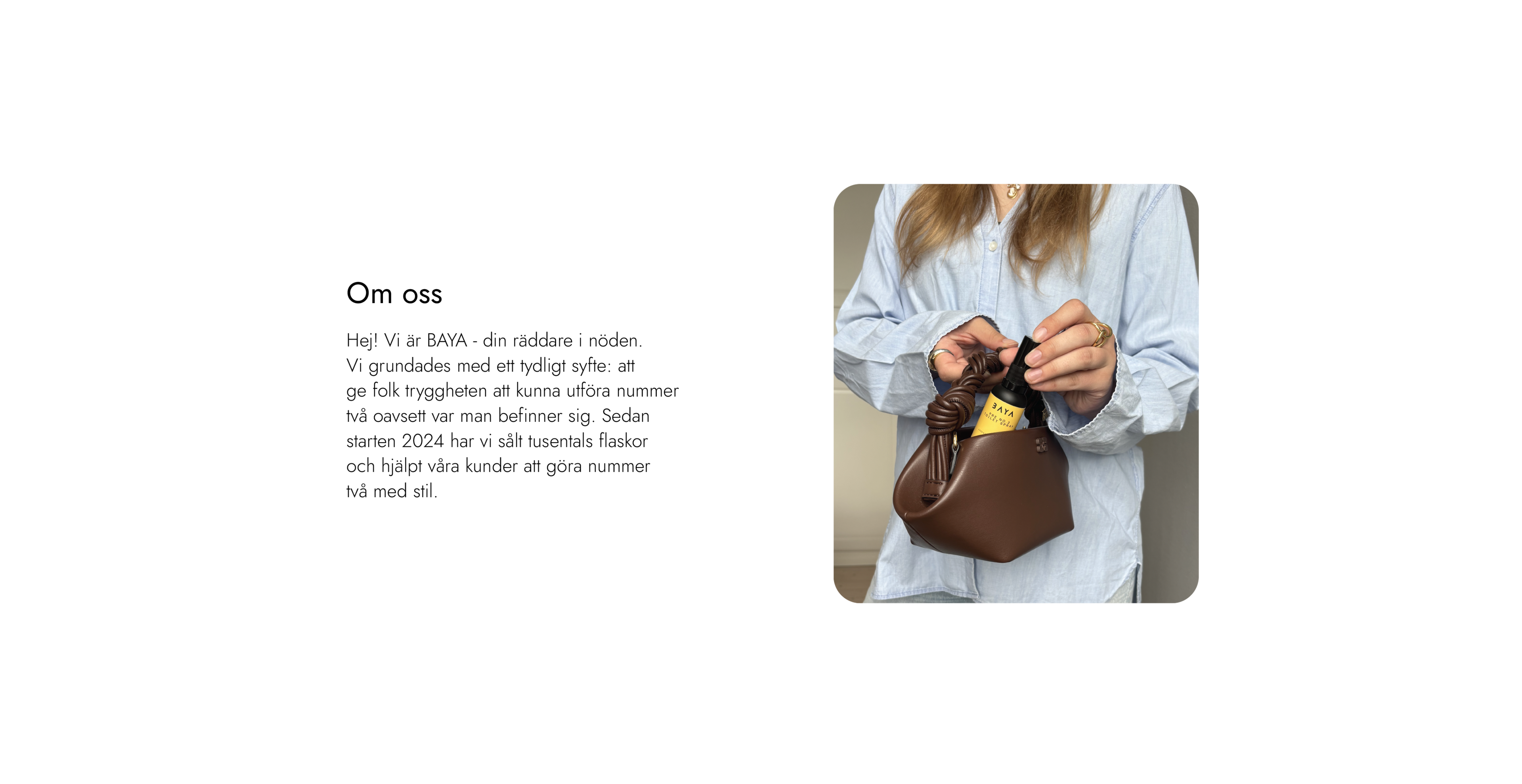 Hej! Vi är BAYA - din räddare i nöden. Vi grundades med ett tydligt syfte: att göra folk trygga med att utföra nummer två oavsett situation. Sedan starten 2024 har vi sålt tusentals flaskor och hjälpt våra kunder att göra nummer två med stil.